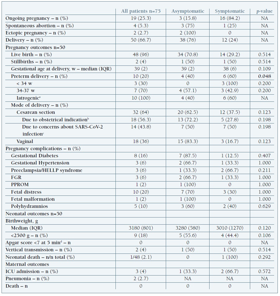 Preterm delivery was also common in patients without pneumonia, especially in symptomatic women (p=0.048). All premature births were iatrogenic, mostly due to fetal distress. The absence of spontaneous preterm delivery in our cohort is consistent with published data. (10