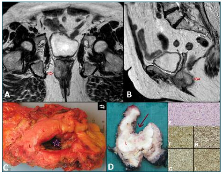 Figure 1 Pelvic T2-weighted coronal (A) and sagittal (B) MR images showing a lobulated mass (arrow) with high signal intensity located posteriorly in the inferior third of the vagina and invading the anal canal. Gross specimen (C,D) showing the lesion (L) with an ulcerated area (star in C, arrow in D) in the posterior wall of the vagina. At high magnification, the lesion is composed of fascicles of spindle shaped cells (E, H&Estain X 200) with expression of smooth muscle actin (F, X 100),Vimentin (G, X 100), caldesmon (H, X 100) and CD99 (I, X 100),