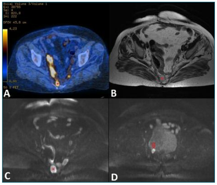 Figure 2 PET-CT scan (A) showing areas of increased uptake of FDG-F18 in the presacral region suggestive of active disease (*). On T2-weighted axial MR image (B) the nodule is hypointense (*) and exhibit significant restriction of diffusion on diffusion-weighted axial MR image (C), suggestive of tumour recurrence. Similar lesions were detected adjacent to posterolateral wall of the bladder (arrow at D).