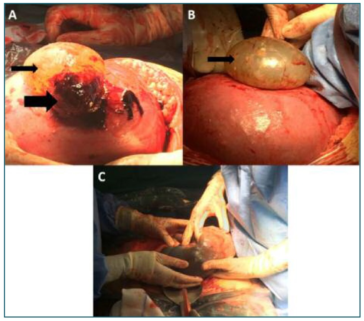 FIGURE 1 (A) and (B) A 5 cm uterine fundus rupture with protrusion of intact amniotic sac (thin arrow). Active mild-to-moderate bleeding from the placental border (thick arrow). (C) Extraction of the fetus closer to the uterine rupture (first fetus), fetus inside amniotic sac.