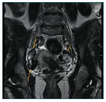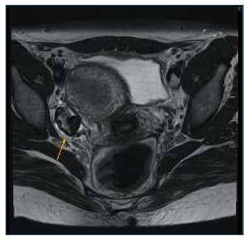 On the surface of the right ovary, a hypersignal focus (5.5mm) was identified in T1-weighted fat suppressed sequences, which may have corresponded to a small cyst with protein content. However, based on the signal pattern, a focus of superficial endometriosis cannot be excluded. In conclusion, suggestive aspects of ovarian fibromatosis were found.