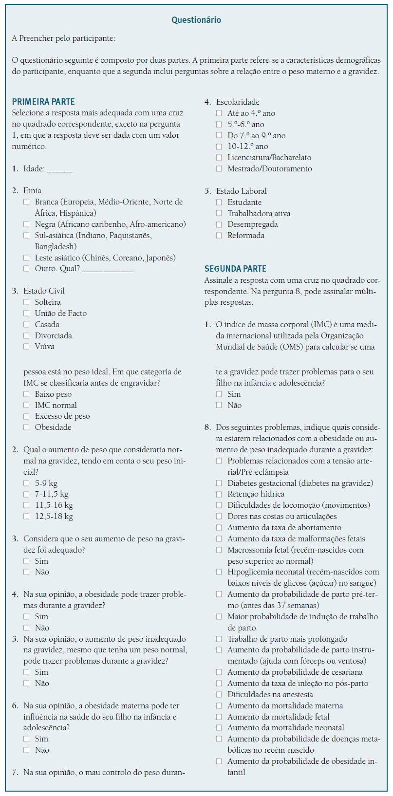O questionário era constituído por 2 partes, a primeira com 5 perguntas para caracterização sociodemográfica (idade, etnia, estado civil, escolaridade e estado laboral) e a segunda com 8 perguntas de resposta rápida, cujo objetivo era avaliar a perceção da grávida relativamente ao seu peso pré-gestacional, GPG, e conhecimento das consequências da obesidade e GPG excessivo. O questionário encontra-se disponível para consulta, na íntegra, nos Anexos.
