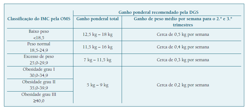 Para diminuir o seu impacto e otimizar os desfechos obstétricos, existem recomendações relativamente ao GPG adequado, atendendo ao IMC prévio, sendo que, em Portugal, estão vigentes as recomendações da Direção Geral de Saúde (DGS) (Quadro I ) (11.