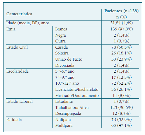 Dos 157 questionários entregues durante o período de estudo, 19 foram excluídos por preenchimento incompleto, contendo a amostra final 138 grávidas. A caracterização sociodemográfica da amostra encontra-se disposta no Quadro II.