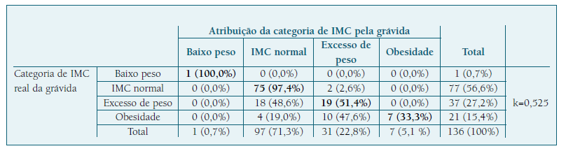 A perceção das grávidas sobre o seu IMC e a sua correspondência com o IMC real encontra-se exposta no Quadro III. Três quartos (n=102) classificaram o seu IMC pré-gestacional corretamente (k=0,525), indicando uma concordância moderada. Esta verificou-se sobretudo no grupo com IMC normal: 97,4% (n=75) das grávidas com IMC normal, 51,4% (n=19) com EP e apenas 33,3% (n=7) com obesidade classificaram-se corretamente. Das 34 mulheres que classificaram incorretamente o seu IMC, 32 (94,1%) atribuíram uma categoria abaixo do seu IMC real, todas estas pertencentes aos grupos com EP ou obesidade.