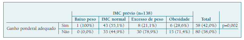 Verificou-se uma diferença estatisticamente significativa (p<0,001) entre a mediana do IMC pré-gestacional do grupo com GPG adequado (22,59; AIQ 21,55-24,83) e a mediana do grupo com GPG inadequado (25,71; AIQ 22,03-29,40). A análise por categorias de IMC corroborou esses resultados (p=0,002), sendo que grávidas com EP ou obesidade apresentaram menos frequentemente GPG adequado. Mais de metade das grávidas com IMC pré-gestacional normal (55,1%; n=43) apresentaram GPG adequado, enquanto apenas 21,1% (n=8) com EP e 28,6% (n=6) com obesidade o fizeram (Quadro IV).