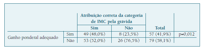 O grupo de grávidas que classificou erroneamente a sua categoria de IMC pré-gestacional teve maior proporção de GPG inadequado quando comparado ao grupo que a atribuiu corretamente (76,5% versus 52,0%; p=0,012) (Quadro V).