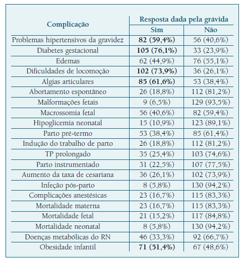 As complicações que foram assinaladas mais frequentemente (diabetes gestacional, problemas hipertensivos da gravidez, dificuldades de locomoção e algias articulares) foram-no também em outros estudos13,16.
