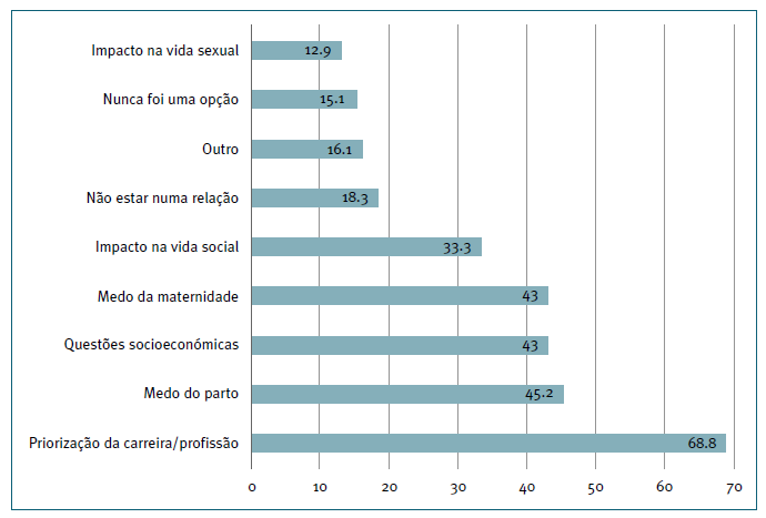 As jovens que negavam ou questionavam a maternidade futura apontaram como fatores influenciadores dessa decisão: priorização da carreira ou profissão (68,8%, n=64), medo do parto (45,2%, n=42) e da maternidade (43%, n=40), questões socioeconómicas associadas (43%, n=40) e impacto na vida social (33,3%, n=31). Não estar numa relação (18,3%, n=17) e o impacto na vida sexual (12,9%, n=12) foram os fatores menos citados como influenciadores na decisão de não ter filhos. Esta informação encontra-se detalhada na Figura 1.