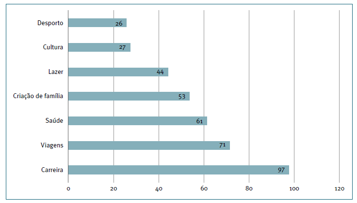 A carreira (97,4%, n=259) foi apontada como a principal prioridade das estudantes da Universidade do Minho, nos próximos 10 anos, enquanto a criação de família é considerada por 53,4% (n=142). Outras prioridades apontadas estão descritas na Figura 2.