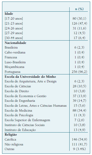 Foram incluídas no estudo 266 estudantes com idades compreendidas entre os 17 e os 44 anos. A média de idades da amostra foi de 22,46 (± 4,2) anos. A maioria das participantes (96,2%, n=256) eram portuguesas. Obtiveram-se respostas de onze escolas da Universidade do Minho. A Escola de Medicina registou o maior número de respostas (34,4%, n=88), seguida da Escola de Engenharia (14,7%, n=39) e da Escola de Economia e Gestão (13,9%, n=37). Relativamente à religião, destaca-se que 54,9% (n=146) das inquiridas afirmam-se católicas e 42,5% (n=113) não religiosas. As características sociodemográficas encontram-se sumariadas no Quadro I.