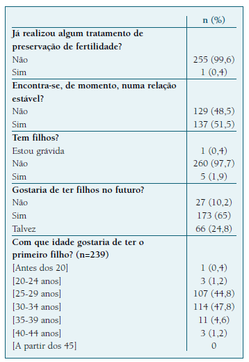 A fertilidade era uma preocupação de 69,2% (n=184) das participantes, não havendo diferenças significativas entre a média de idades dos dois grupos (p=0.998) A maioria respondeu não ter filhos (97,7%, n=260), porém a maternidade era considerada por 89,8% (n=239) no futuro. Apenas uma participante foi submetida a tratamentos de fertilidade. Cerca de metade das estudantes (51,5%, n=137) encontrava-se, de momento, numa relação estável. Verificou-se uma relação estatisticamente significativa entre estar numa relação atualmente e o desejo de ter filhos (p<0.001). Quando questionadas acerca da idade com que gostariam de ter o primeiro filho, 47,8% (n=114) respondeu o intervalo 30-34 anos, 44,8% (n=107) o intervalo dos 25-29 anos e 5,8% (n=14) o intervalo ≥ 35 anos Quadro II.