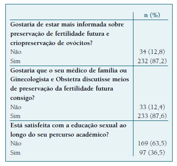 Quanto à possibilidade futura de recorrer à criopreservação eletiva de ovócitos como forma de preservar a fertilidade, 22,6% (n=60) das jovens consideravam-se potenciais utilizadoras desta técnica, e 28,2% (n=75) apenas se disponível no Serviço Nacional de Saúde (SNS). Já 35% (n=93) não tinham opinião formada e 14,3% (n=38) afirmavam não ser uma opção.