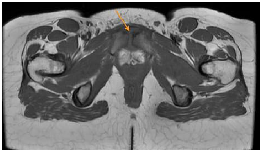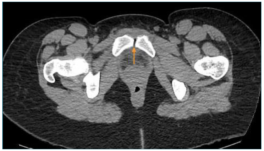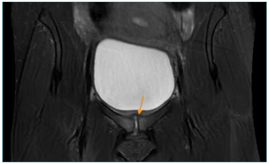For this reason, a computed tomography (CT) was performed and showed pre-pubic soft tissues higher density and intra-articular air in the symphysis pubis (Figure 1), which led to suspicion of an osteitis. A magnetic resonance imaging (MRI) confirmed the diagnosis by showing hyperintense T2 signal and cortical irregularities on the articular surface associated with few intra-articular fluid and densifications of the soft tissues (Figures 2 and 3). At the same time, blood cultures were positive for Streptoccocus Anginosus and a puerperal osteomyelitis pubis was assumed. Antibiotic therapy was changed to intravenous benzylpenicillin (24 million Units per day), according to the antibiogram. Considering the high diagnostic certainty, based on clinical and imagological features, and technical difficulties, an aspirative biopsy was not performed. In consideration to Streptoccocus Anginosus found on blood cultures, the patient was submitted to an echocardiogram that excluded any sign of endocarditis.