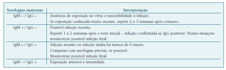 O gold standard no diagnóstico da infeção materna é a deteção serológica de anticorpos IgM e IgG (Quadro I). (1,4,5,8,9,11,25 Os anticorpos IgM são detetados 7-10 dias após contacto com o vírus e podem persistir por aproximadamente 140 dias1,4,5,9,15.