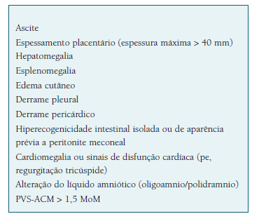 Marcadores ecográficos compatíveis com infeção fetal por PB19 (Quadro II); (5,7,14,15,22