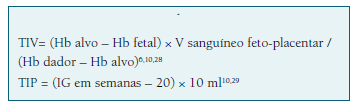 O volume sanguíneo a transfundir pode ser estimado através de várias fórmulas (Quadro III) (6,10,28,29. Alguns autores relatam maior mortalidade fetal com volumes superiores a 20 ml/kg, explicada pela baixa tolerância dos fetos hidrópicos ao overload circulatório6,10,30.