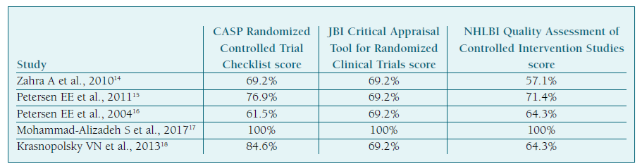 After the mentioned screening, the authors assessed the five included articles, described as randomized clinical trials, regarding the quality of their methodology. To do so, auxiliary tools for assessing the quality of randomized clinical trials were used, such as from Critical Appraisal Skills Programme, Joanna Briggs Institute or National Heart, Lung and Blood Institute. The compilation of quality appraisal scores for each study is presented in Table II. The authors established a score threshold of 50% or more for each article, across all tools, as the criteria for final inclusion in the results and discussion.