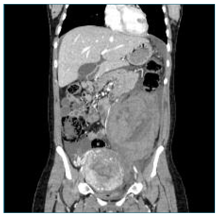 Figure 2 Abdominal-pelvic CT scan performed 2 days postpartum, showing a retroperitoneal hematoma measuring at least 12 × 13.4 × 19 cm (anteroposterior × transverse × longitudinal), localized in the left flank and iliac fossa. An enlarged uterus with a heterogeneous enhancement pattern results from normal postpartum changes.