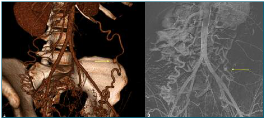 Figure 3 (A) Three-dimensional CT scan reconstruction showing a 7 mm saccular structure in the LOA, consistent with an ovarian artery pseudoaneurysm. No active bleeding was observed at the time of image acquisition, though intermittent hemorrhage was suspected; (B) Diagnostic angiography confirming the OAA in the LOA with active bleeding proximally to the pseudoaneurysm. The yellow arrows represent the OAA identified in both imaging diagnostic tools.