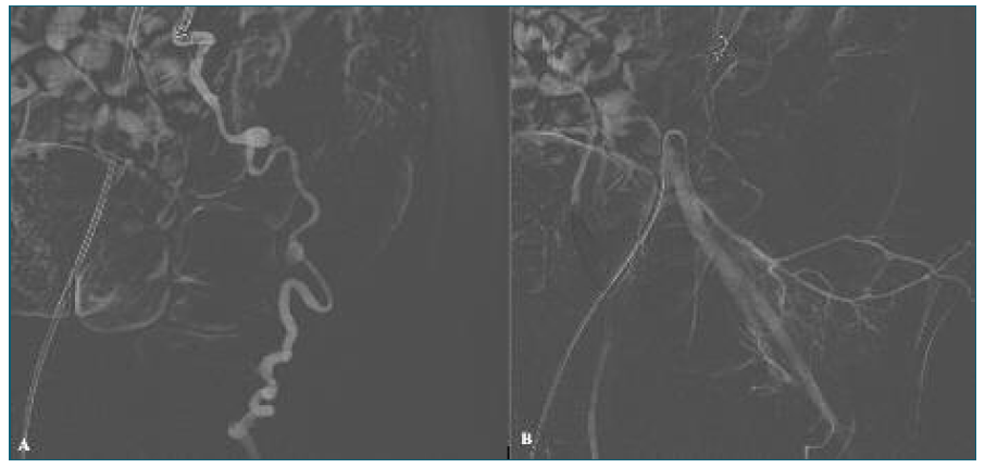 Figure 4 (A) Using a Cobra catheter via the common femoral artery, the proximal segment of the LOA was accessed and embolization with micro-coil was performed (MReye® coils, 3.0- and 4.0-mm). Due to contrast leakage after catheterization of the distal LOA, additional embolization with thrombin and a 6.0-mm micro-coil was performed. (B) Post-embolization control angiography through the left hypogastric and left common iliac arteries showed no evidence of active bleeding, confirming successful occlusion of the LOA.