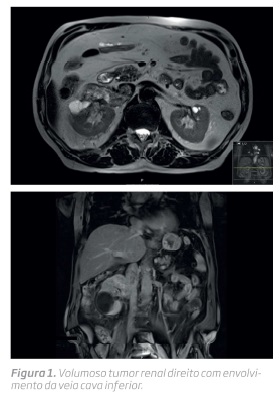 Homem de 75 anos sem antecedentes de relevo foi referenciado à consulta de Urologia por volumosa massa renal direita com extensão à veia cava inferior infrarrenal, observado em ressonância magnética nuclear (RMN) (fig 1). O doente foi proposto para nefrectomia radical e uma vez que apresentava um trombo tumoral na veia renal que se estendia à veia cava inferior foi solicitada a colaboração da Angiologia e Cirurgia Vascular.