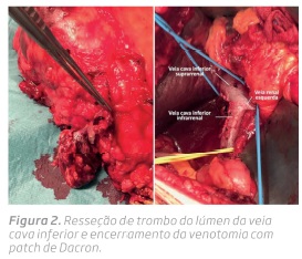 O doente foi submetido a nefrectomia radical com exérese de trombo da veia renal esquerda que se estendia à veia cava inferior que apresentava adesão à parede posterior da veia tendo sido feita recessão parcial da veia cava e posterior encerramento com patch de Dacron (fig 2).