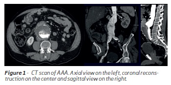 A new contrast enhanced CT scan was made and showed an infrarenal aortic aneurysm with a 2.5 mm neck, 19mm neck's diameter and 67 mm maximum diameter. The right common iliac artery aneurysm had 35 mm diameter. The aneurysm sac had a circunferencial non fissured intraluminal homogeneous thrombus and moderate calcificacion. The aneurysm neck did not have any significant thrombus or calcification. No lesions were detected in the thoracic aorta. (Figure 1)