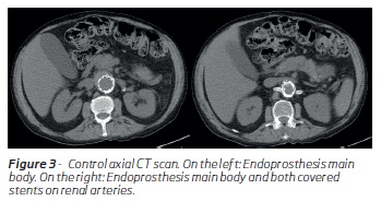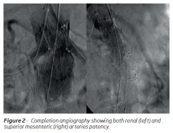 Both humeral arteries were exposed under local anesthesia and the renal arteries catheterized with the stent graft delivery catheters. Under spinal anesthesia a cut down exposure of the right and left femoral arteries was made, and the aortic endoprosthesis main body was delivered via femoral access. A proximal aortic extension cuff 28mm long was required to increase sealing. Two iliac artery extensions were also deployed ipsilateral via right and left femoral access. The completion angiography showed an excluded aneurysm with no endoleaks and patency of both renal arteries and superior mesenteric artery. (Figure 2)