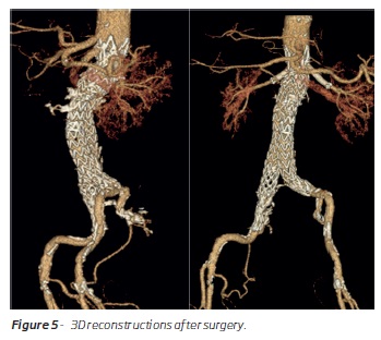 Before discharge, the patient had a control CT scan where no evidence of endoleaks were detected. (Figure 3,4 and 5)