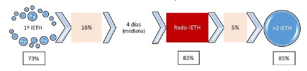 5 doentes (5%) foram submetidos a 3 ou mais procedimentos de IETH. A taxa cumulativa de trombose completa do FA femoral após estes sucessivos procedimentos foi de 85% (Esquema 1).