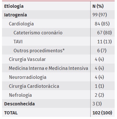 Os FA femorais iatrogénicos apresentavam como etiologia mais frequente um procedimento realizado pela especialidade de Cardiologia (85%). Os mais comuns foram cateterismo coronário prévio (80%) e procedimento prévio de TAVI (transcatheter aortic valve implantation - 13%).