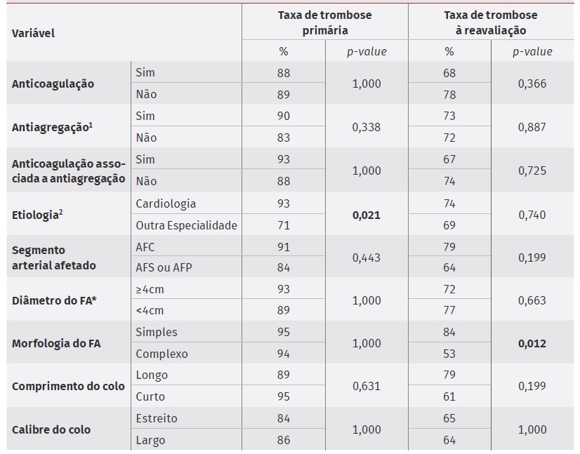 Não se verificou associação estatisticamente significativa entre as referidas taxas de trombose do FA e a realização de antiagregação e/ou anticoagulação, o segmento arterial afetado, o diâmetro do FA e as características do seu colo. Os falsos aneurismas com etiologia em iatrogenia pela Cardiologia apresentaram uma taxa de trombose primária superior (93%), comparativamente com os FA iatrogénicos por outras especialidades (71%; p=0,021). No entanto, a diferença da taxa de trombose à reavaliação em ambos os grupos não era estatisticamente significativa. Os FA simples associaram-se a taxas superiores de trombose à reavaliação (p=0,012) - Tabela 3.