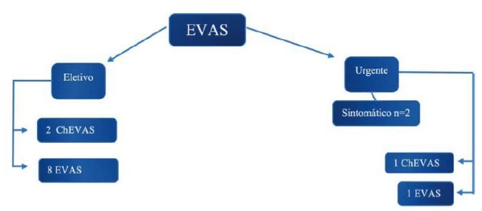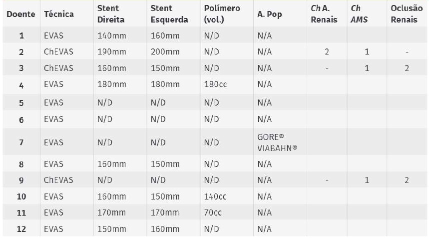 Realizaram-se 3 ChEVAS e 9 EVAS sem procedimentos aórticos complementares. Dos ChEVAS, dois foram realizados em contexto eletivo e 1 em contexto urgente (por EL tipo 1a sintomático pós-EVAR). Em dois destes, foi realizada uma chimney para a AMS, com oclusão intencional das artérias renais, por razões anatómicas e por serem doentes com DRC pré-hemodiálise. No terceiro caso, foram colocadas chimneys para as artérias renais e artéria mesentérica superior.