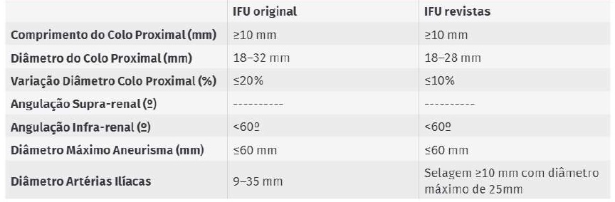 A endoprótese Nellix® (Endologix Inc., Irvine, CA) foi introduzida na Europa em 2013, com indicação no tratamento de aneurismas da aorta abdominal e ilíacos (AAA). É composta por dois stents cobertos (ePTFE) expansíveis por balão (10mm de diâmetro) e dois endobags de poliuretano, que são preenchidos por um polímero de polietilenoglicol, obliterando assim o saco aneurismático e excluindo-o da circulação - Endovascular Aneurysm Sealing (EVAS)(1).Inicialmente, foi introduzida com instruções para uso (IFU) alargadas, possibilitando a utilização em AAA de anatomia mais complexa e associava-se supostamente a uma redução da incidência de endoleak (EL) tipo 1, 2 e 3, bem como de migração protésica(2).Porém, durante a experiência a médio prazo com esta endoprótese, foi descrito um elevado número de complicações, levando à restrição progressiva das IFU (Tabela 1). Atualmente, o seu uso livre foi descontinuado e apenas está disponível em centros aprovados e no contexto de investigação clínica.
