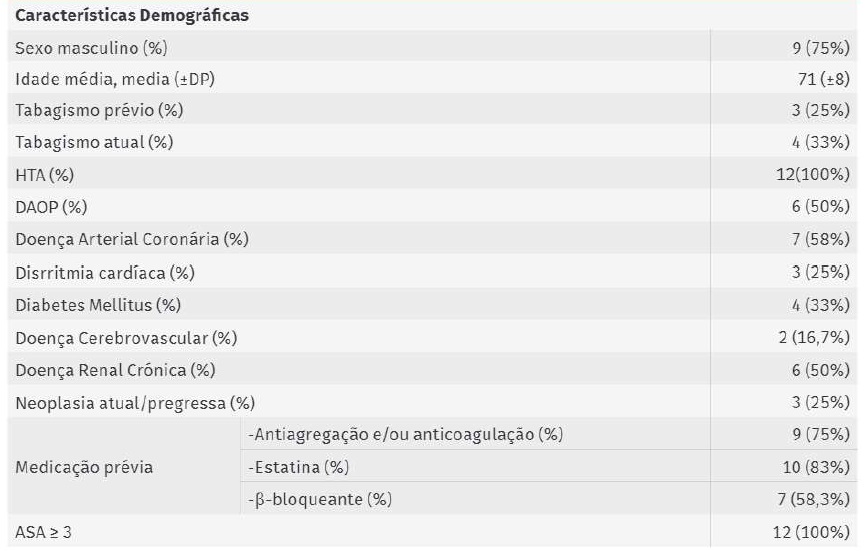 Do total da amostra, 85% (n=10) dos doentes encontravam-se sob terapêutica hipolipemiante com estatina, 9 (75%) com anticoagulação e/ou antiagregação e 7 (58%) com β-bloqueante.