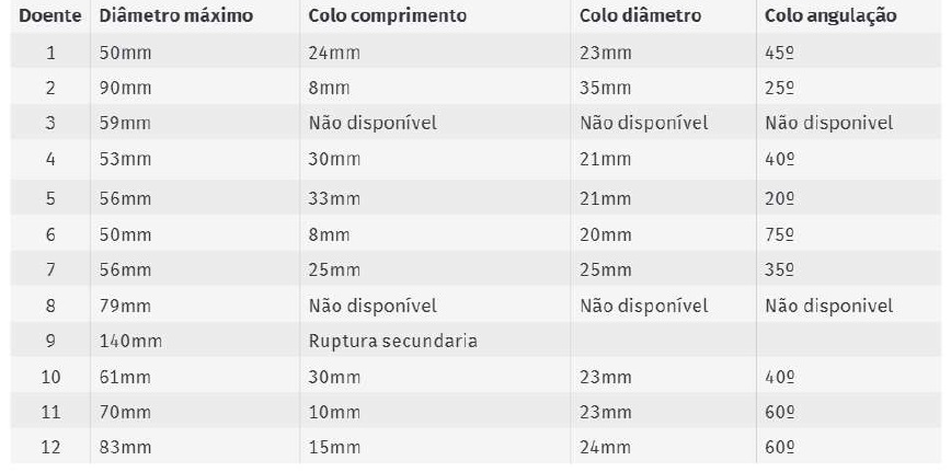 Entre os anos de Outubro de 2015 e Novembro de 2017 foram tratados 12 doentes, 9 (75%) do sexo masculino e 3 (25%) do sexo feminino, submetidos a 12 intervenções cirúrgicas. Os doentes apresentam uma idade média de 71(±8) anos. Na admissão, todos os doentes tinham hipertensão arterial (n=12), 58% doença arterial coronária (n=7), 58% tabagismo atual ou pregresso (n=7), 50% DAOP (n=6), 50% doença renal crónica (n=6), 33% diabetes mellitus (n=4), 25% disritmia cardíaca e/ou história de neoplasia pregressa (n=3). Dois doentes tinham como antecedente ainda doença cerebrovascular (17%). (Tabela 2) Não foi objetivada história familiar de patologia aneurismática.