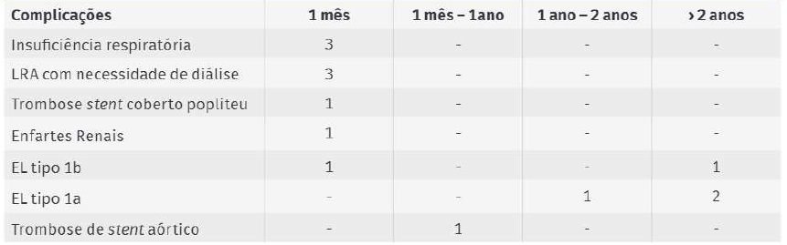 Exceptuando a trombose de stent aórtico, o diagnóstico de complicações relacionadas com o aneurisma após os 30 dias deu-se predominantemente a partir do segundo ano de cirurgia, tendo sido observados endoleaks tipo 1a e/ou 1b em 3 doentes.