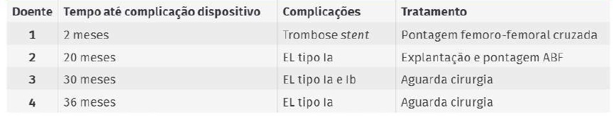 Após os 30 dias, observaram-se complicações relacionadas com a endoprótese em 4 doentes. Aos 2 meses de follow-up, verificou-se trombose de um stent aórtico num doente, tendo sido submetido a pontagem femoral cruzada. Em três doentes, no follow-up imagiológico, foi detetado EL tipo 1a aos 20, 30 e 36 meses, respetivamente. Um destes doentes apresentava concomitantemente endoleak tipo 1b. Segundo a classificação de van den Ham et al. para os endoleaks proximais, dois doentes apresentavam EL tipo Is3 (presença de contraste ou trombo fresco entre os endobags ou dentro do saco aneurismático) e um EL tipo Is1 (presença de contraste entre os endobags e a parede do colo proximal, porém sem contraste no saco aneurismático) (Tabela 6). Um dos doentes com EL tipo 1a foi submetido a explantação protésica e reconstrução em pontagem aorto-bi-femoral, com morte no período peri-operatório precoce por insuficiência respiratória secundária a pneumonia e ARDS (acute respiratory distress syndrome).