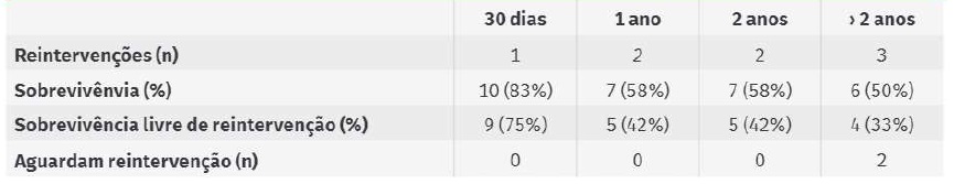 Nesta análise retrospetiva dos casos de EVAS realizados na nossa instituição, apesar do sucesso técnico de 100%, verificou-se um elevado número de complicações e mortalidade a curto prazo com mortalidade aos 30 dias de 16% (n=2) e intra-hospitalar de 25% (n=3), sendo que em um dos óbitos se verificaram complicações precoces da endoprótese e relacionadas com o procedimento (El tipo 1b e enfartes renais por embolização). A médio e longo prazo, particularmente a partir do 2º ano pós-operatório, verificou-se uma taxa elevada de complicações da endoprótese, sendo o EL tipo 1a (n=3) a mais frequente.