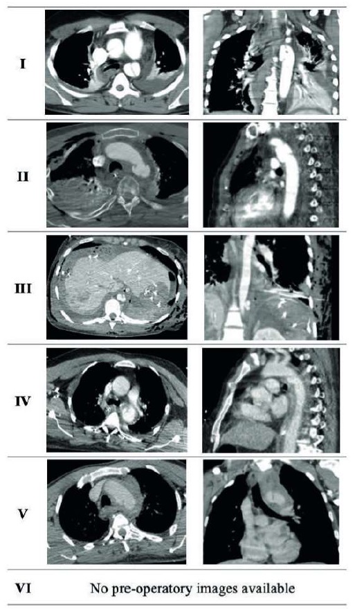 We identified six patients with TTAI who underwent TEVAR between 2010 and 2019 (Table 1). All were victims of high impact deceleration trauma, five car accidents and one fall. Ages varied from 24 to 57 years old (mean age 40 years old), two were smokers with no other know diseases. Additional major injuries were present in all patients as manifested by an Injury Severity Score of 14 to 57.