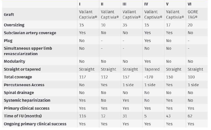 In our center, and according to current literature, upper limb revascularization is never done systematically in emergency cases, being reserved for patients that manifest with upper limb ischemia or neurological symptoms. Spinal drainage is not used routinely as well, especially in cases of TTAI, due to the perception that a relatively small coverage of the thoracic aorta is performed, and that an epidural puncture in a trauma patient may be more deleterious, being reserved for patients with post-operatory neurologic symptoms.