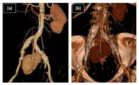 Figure: Iliac branch device for ectopic renal preservation. [a] Pre and [b] postoperative 3D reconstruction CTA of common iliac aneurysms exclusion with bilateral iliac branch devices and preservation of pelvic kidney’s artery.