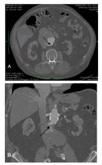 Endovascular aneurysm repair (EVAR) has become a current standard of care for abdominal aortic aneurysms (AAA). Continuous development in endovascular treatment of aortic aneurysms, together with growing experience and encouraging results, have opened the way for a new generation of stent-grafts.1 However, the long-term success is limited by complications, most importantly endoleaks, that are associated with high reintervention rates. In case of a type Ia endoleak, which represents failure of achieving an adequate proximal seal, secondary intervention is strongly advocated to prevent secondary aneurysm rupture. Different treatment options are suggested such as endoanchors, parallel grafts like chimneys, fenestrated cuffs, embolization, or open conversion.2,3 A type Ia endoleak detected in the operative room can be promptly treated with adjunctive procedures.4 However, a delayed onset of this type of endoleak can reflect progression of the aneurysmatic disease. Dilatation of the proximal neck can occur, with expansion of the aneurysm, eventually resulting in a juxtarenal or pararenal AAA. Endovascular treatment of type Ia endoleaks secondary to aortic neck dilatation can raise many technical challenges related to the previous implanted stent graft.5 Catheterization difficulties are expected due to passage through the limbs or struts of the previous stent graft, in particular in the case of a previous graft with supra-renal fixation stent whose struts can challenge renal catheterization.12