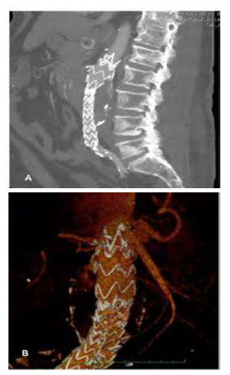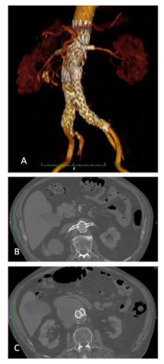Fig 6: Two-month post-operative follow-up CTA. A: Three-dimensional reconstruction of the Fenestrated Stent Graft with patent stents and resolution of type Ia endoleak; B: axial fenestrated stent graft at the level of the renal stents; C: Kissing aortic covered stents in parallel graft configuration)
