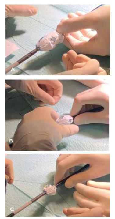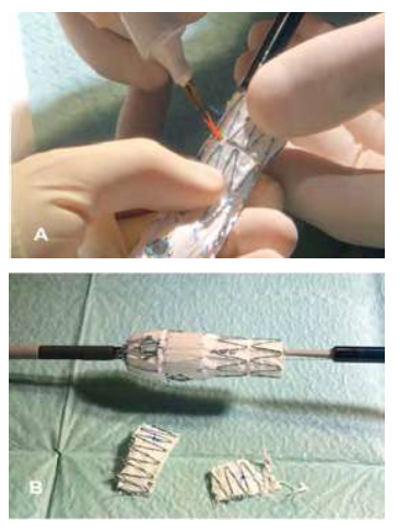 Fig 3 A and B: Fenestrated stent graft partially deployed on-table and cutting the distal stent with thermocautery.