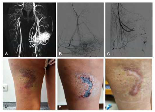 Figure 1 Yakes type IIa arteriovenous malformation (AVM) of the thigh. A) magnetic resonance angiography (MRA) showing infiltrative AVM with afferent branches from the deep femoral artery; B) pre-treatment angiography; C) final result after nidus embolization with polidocanol (3%) and PVA 500-710microns and afferent obliteration with Concerto® microcoils (2x40(x2); 2x60; 2x80; 3x40(x2); 3x80); D) pre-treatment macroscopic findings; E) post-intervention necrosis of the overlying skin; F) complete healing by the 3rd month after embolization
