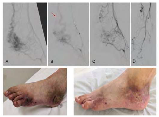 A) pre-treatment angiography, inflow through branches from the posterior tibial, peroneal and pedal arteries; B) angiography after transarterial nidus embolization with polidocancol (3%) foam and posterior tibial artery obliteration with Concerto® 4x100 microcoil (arrow) and Onyx34®; nidus access was not compromised given the additional afference by peroneal and pedal arteries’ branches; C and D) angiographic result after transvenous sclerosis with polidocanol (3%) foam of the efferent anterior tibial vein (C) and transarterial nidus embolization nidus with PHIL® 30% via peroneal artery (D), performed during the same procedure; E) pre-treatment clinical findings with painful foot ulceration; F) healing ulcerations after last treatment.