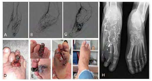 A) pre-treatment angiography; inflow throw anterior and posterior tibial arteries branches; B) angiography after transarterial coil obliteration and Onyx18® embolization of plantar inflow branches, through posterior tibial artery and great saphenous vein sclerosis with polidocanol foam (3%); C) angiography after direct nidus Onyx18® injection followed by embolization of posterior tibial artery plantar branches and distal pedal artery obliteration, both with Onyx18®; D) clinical presentation with toe painful ulcer; E) toe necrosis after the last embolization treatment; F) atypical transmetatarsic toe amputation and residual AVM excision; G) Completely healed and functional stump with resolution of pain complaints; H) post-amputation X-Ray