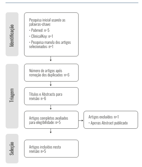 Na pesquisa inicial usando as bases de dados PubMed/MEDLINE e ClincalKey, foram encontrados um total de sete estudos. Um dos trabalhos foi identificado durante a pesquisa manual das referências dos artigos selecionados, sendo, no entanto, excluído uma vez que apenas foi publicado o seu Abstract. Após remoção dos duplicados e revisão dos títulos, resumos e artigos completos, cinco estudos que descrevem o protocolo e resultados obtidos por diferentes autores e serviços que testaram a injeção peri-aneurismática de solução salina para oclusão de pseudoaneurismas femorais foram incluídos.